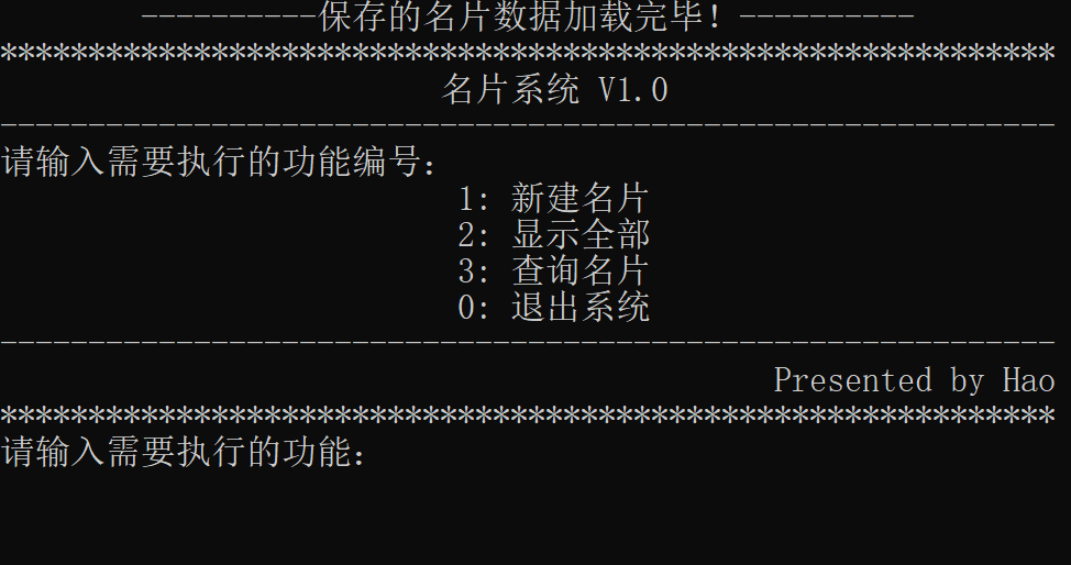 # 显示主功能界面(包含功能:1.新建名片;2.显示全部;3.查询名片;0.退出系统)