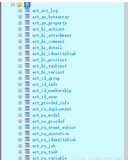ACT_ID_*: 'ID'表示identity。 这些表包含身份信息,比如用户,组等等。
