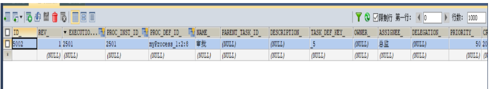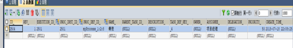 我们在设立就可以看见我们刚开始的一个任务,就是请假,它的EXECUTION_ID_是2501,而这条任务的id是2504,然后执行的任务name是请假,请假的人是ASSIGNEE_项目经理
