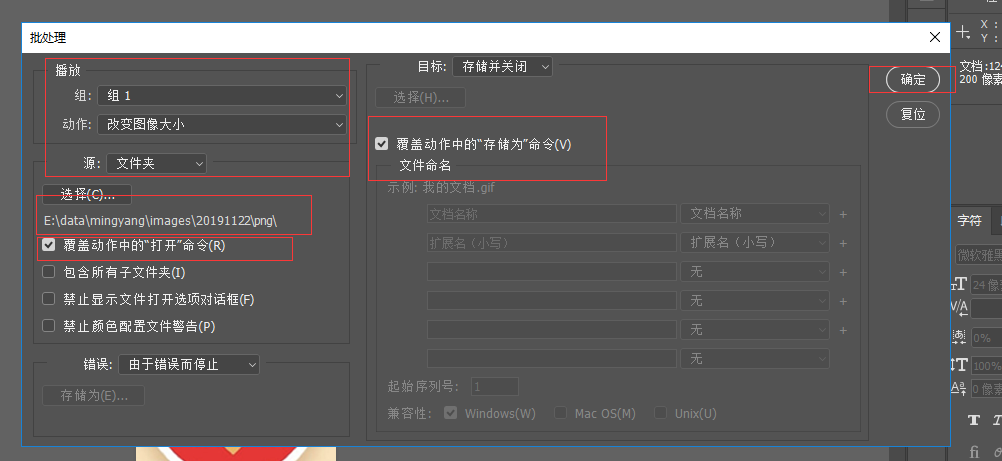 5.点击文件->自动->批处理,选择要执行的动作,选择要执行的目录,选中“覆盖动作中的打开命令”和“覆盖动作中的储存为命令”,点击确实,就会自动处理了。