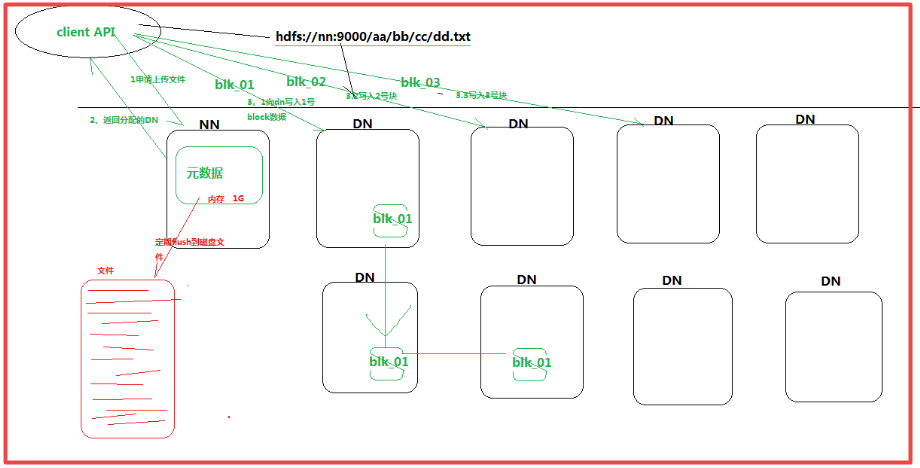 - Client向DN写入block数据(分割是有client管理)