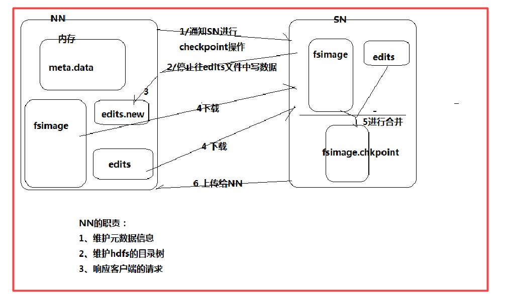 //edits与内存是同步的,在edits存满时候与fsimage合并,他们的格式不一样,这个工作是由NN来操作吗,那么就增加了NN的负荷,因此具体的合并是由secondaryNamenode管理