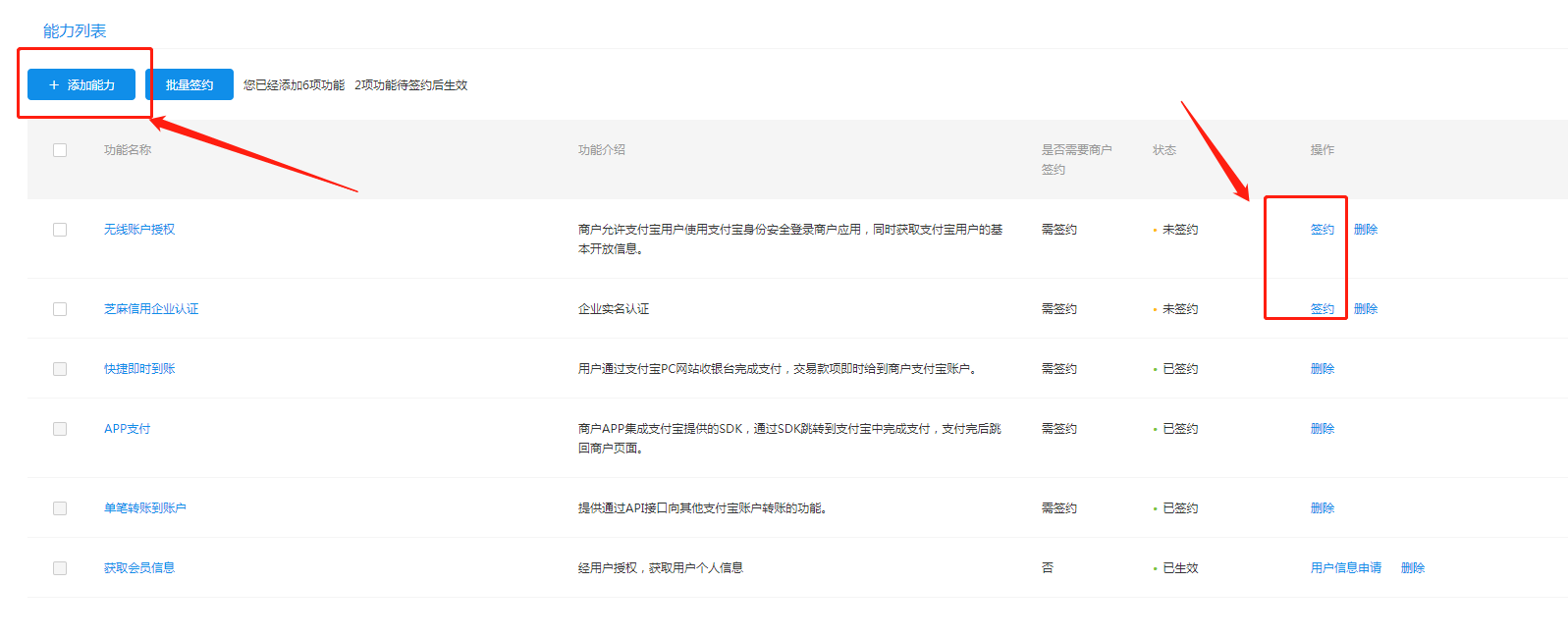 也可以给你创建的应用增加能力,比如APP支付能力,获取会员信息等等。需要注意的是有些功能是需要签约的。如下图所示: