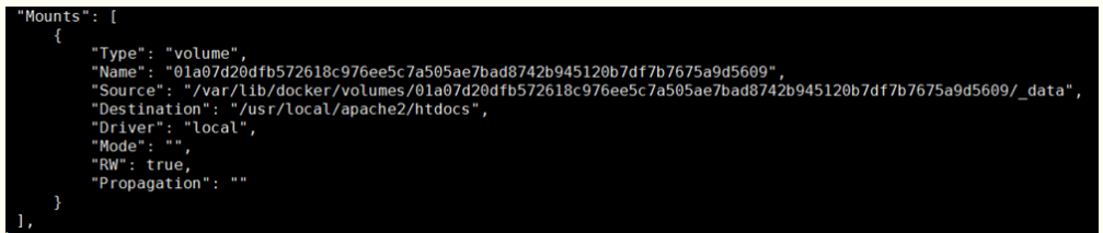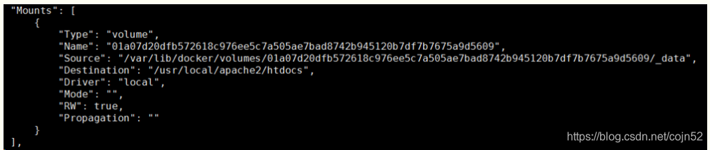 docker inspect 的输出中 Mounts 的部分,显示容器当前使用的所有 data volume,包括 bind mount 和 docker managed volume。