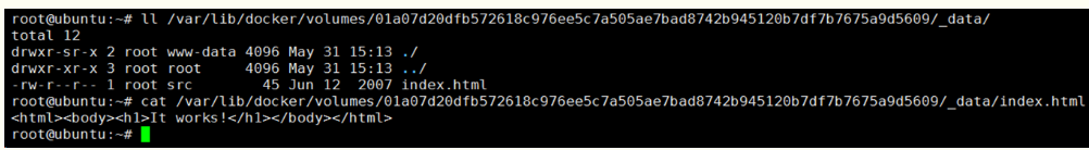 volume 的内容跟容器原有 /usr/local/apache2/htdocs 完全一样的,是因为mount point 指向的是已有目录,原有数据会被复制到 volume 中。