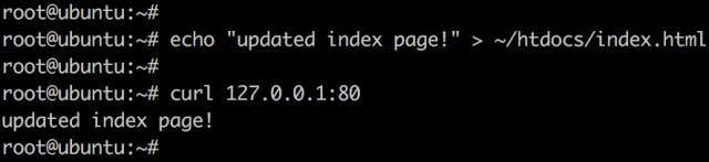curl 显示当前主页确实是 $HOME/htdocs/index.html 中的内容。更新一下,看是否能生效: