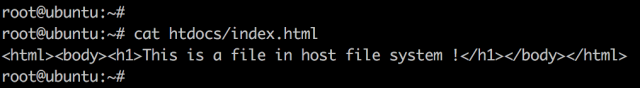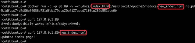 -v 的格式为 <host path>:<container path>。/usr/local/apache2/htdocs 就是 apache server 存放静态文件的地方。由于 /usr/local/apache2/htdocs 已经存在,原有数据会被隐藏起来,取而代之的是 host $HOME/htdocs/ 中的数据,这与 linux mount 命令的行为是一致的