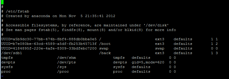 当系统启动的时候,系统会自动地从这个文件读取信息,并且会自动将此文件中指定的文件系统挂载到指定的目录。下面我来介绍如何在此文件下填写信息。