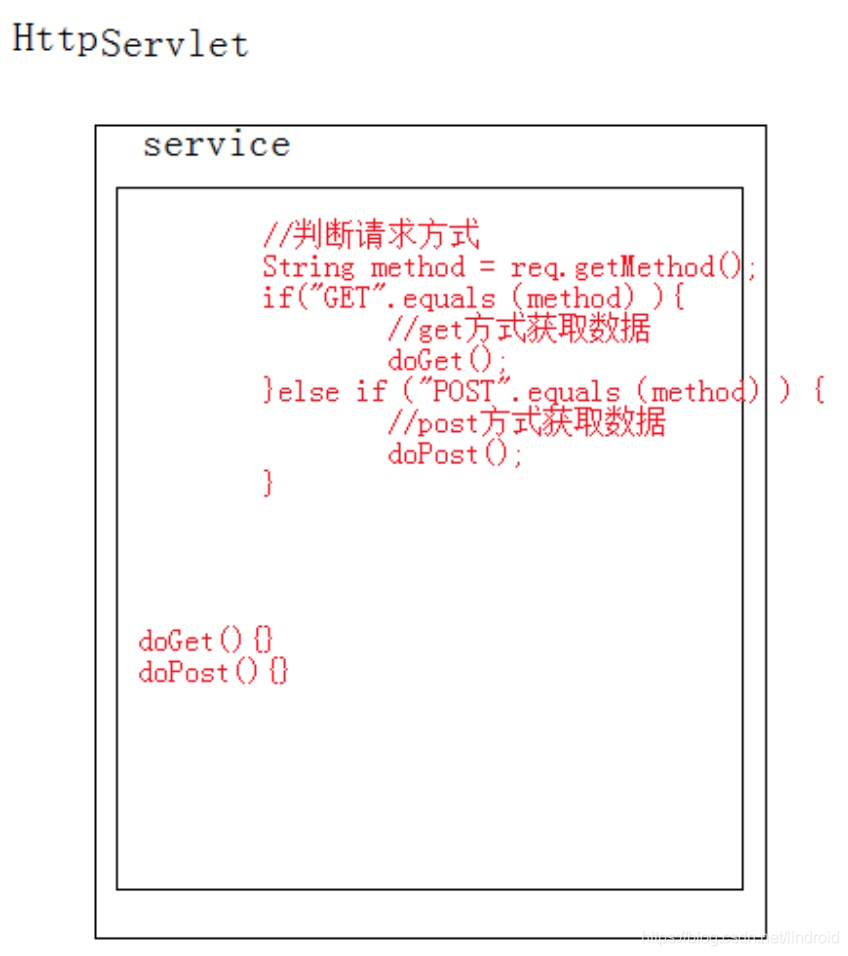 HttpServlet:对http协议的一种封装,用于简化Http请求的操作。如果不用HttpServlet ,通常我们自己实现Servlet时也要用如图写法,对request的请求类型进行区分,然后实现逻辑。所以HttpServlet帮我们做了这件事,简化操作。