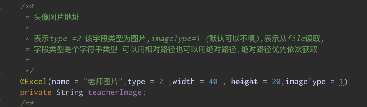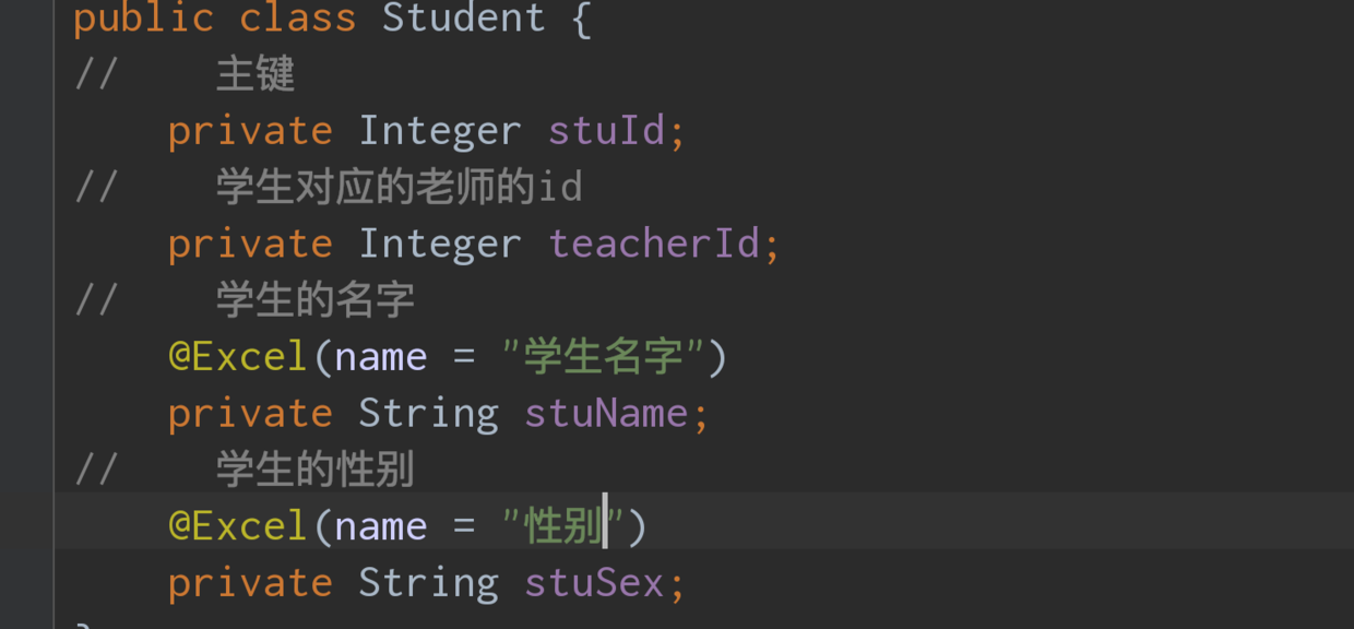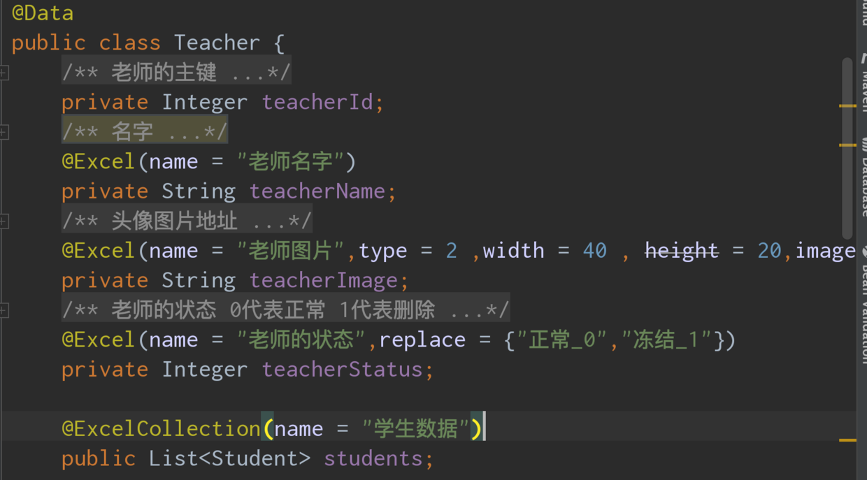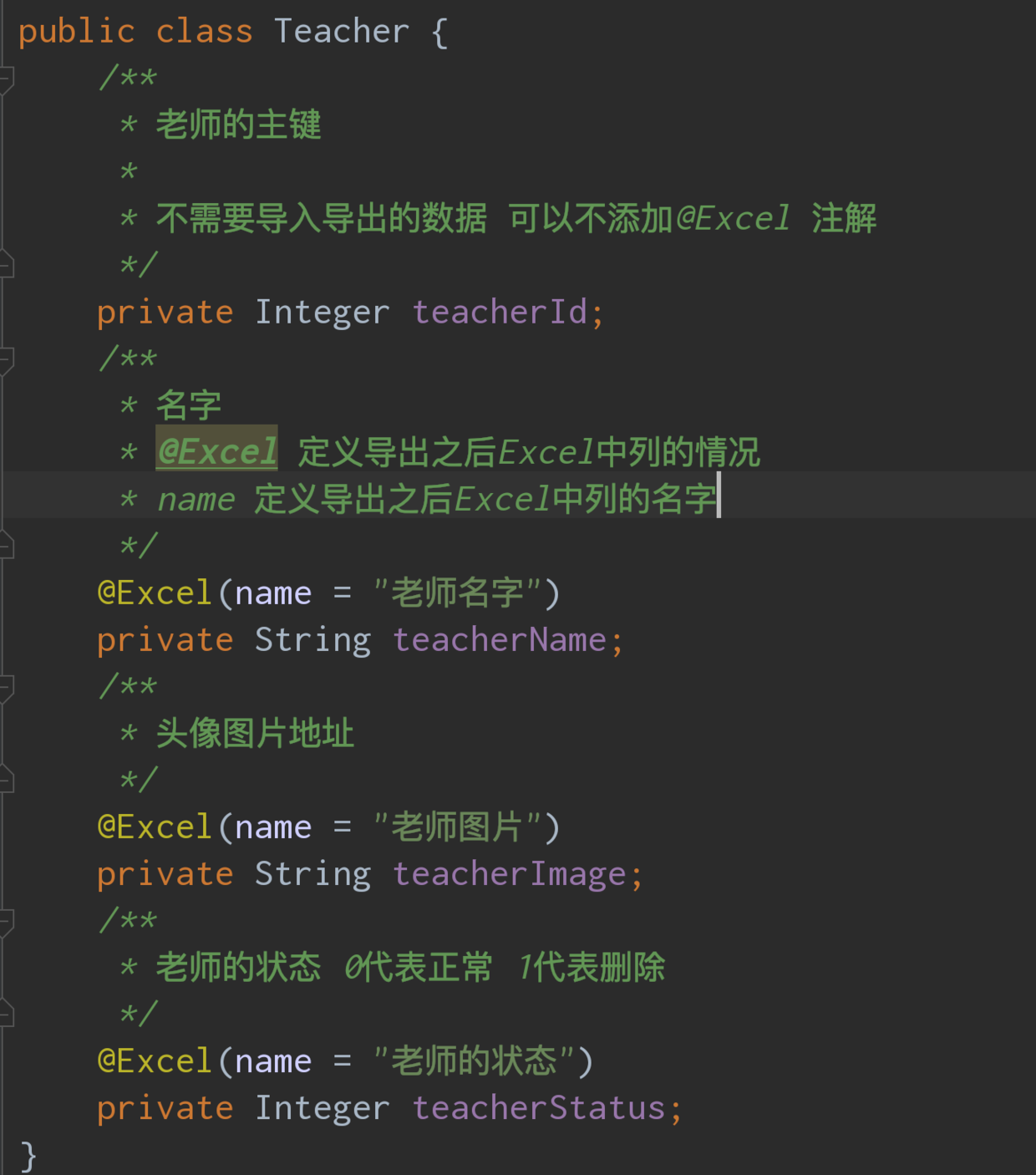我们要导出的数据的实体类是Teacher 所以需要给Teacher加 Easypoi的注解 EasyPoi是注解式开发,所有的注解详情见官方文档,但是如果要完成的需求是最简单的导入导出的话,