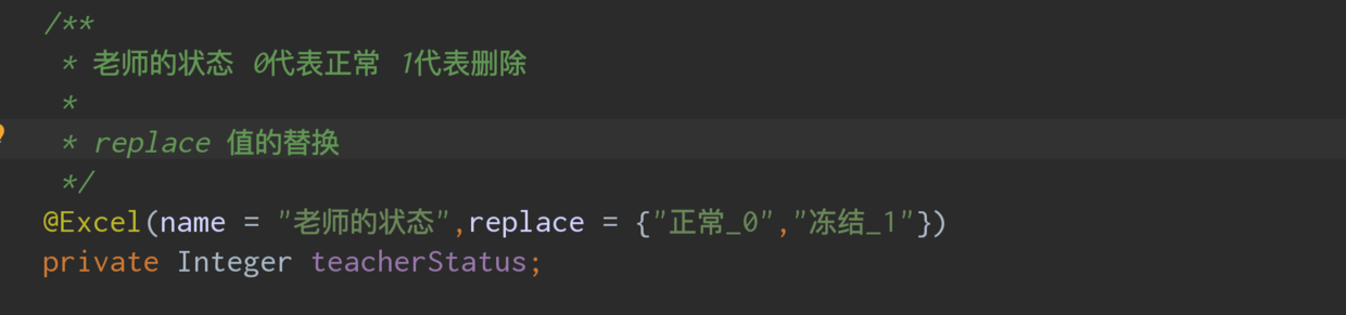 public class Teacher { /** * 老师的主键 */ private Integer teacherId; /** * 名字 */ private String teacherName; /** * 头像图片地址 */ private String teacherImage; /** * 老师的状态 0代表正常 1代表删除 */ private Integer teacherStatus; }省略get set