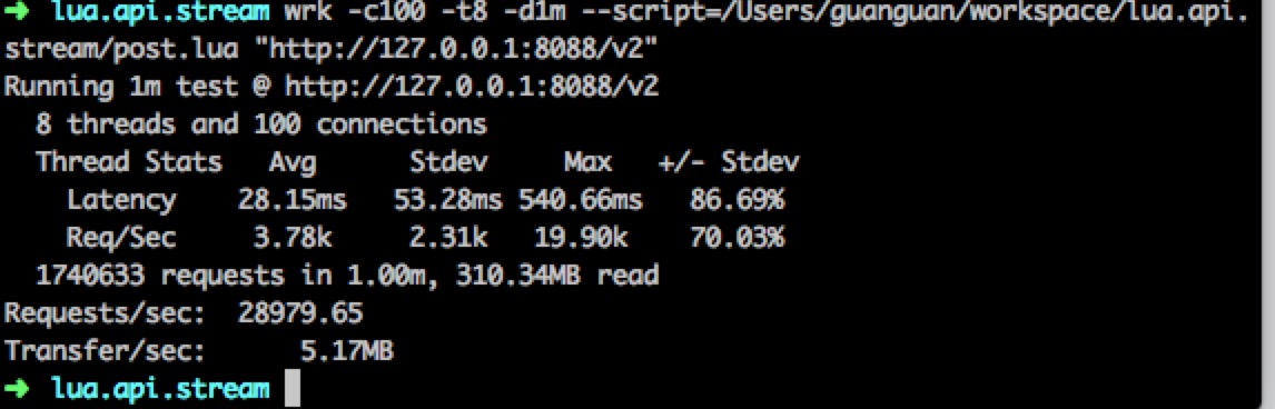 - 命令依然为./wrk -t8 -c100 -d1m --script = post.lua http://localhost:8088/v2