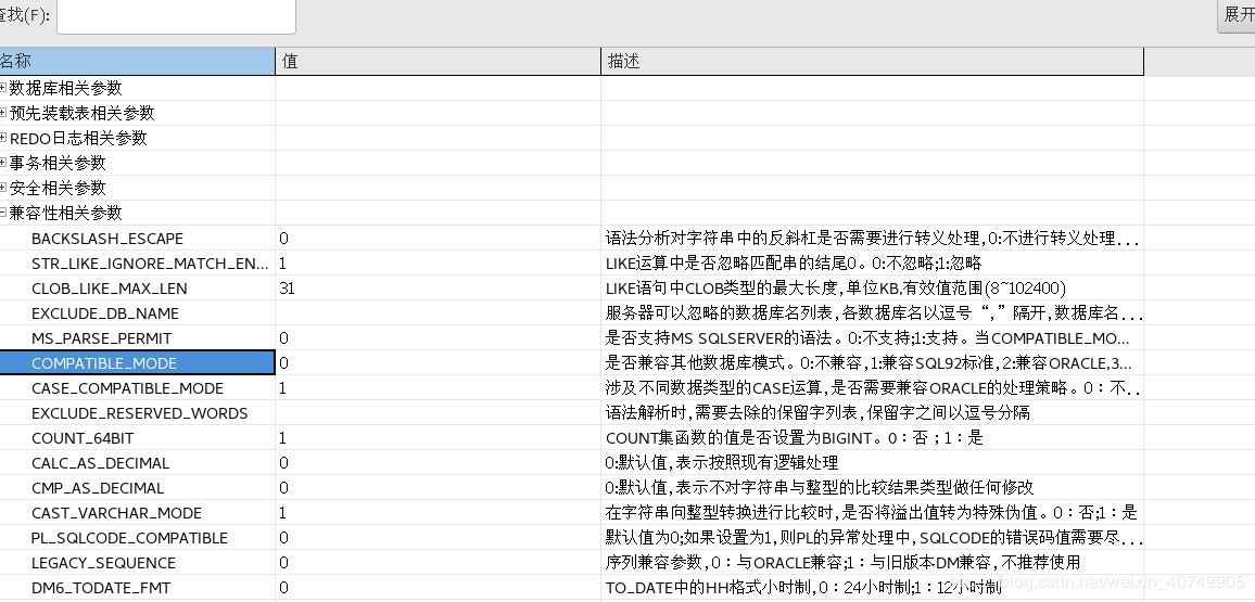 找到兼容性相关参数,打开后可以看到有一个COMPATIBLE_MODE属性:
