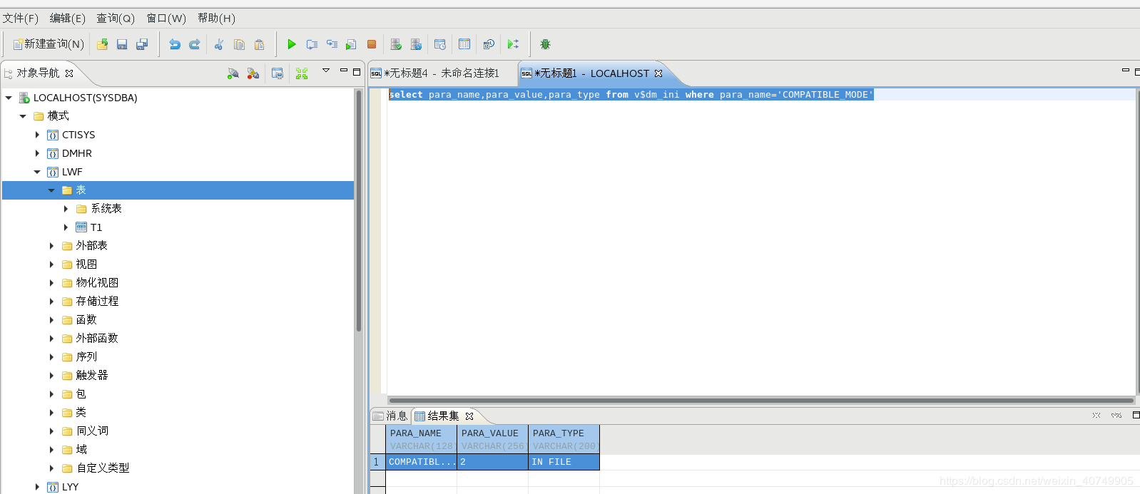 进入到达梦管理工具,执行如下SQL,可以看到已经 COMPATIBLE_MODE已经变成2了,也就是oracle兼容模式。