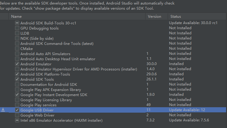 1、手机打开开发者,并且usb连接电脑 2、打开sdk manager,安装google usb driver 3、打开设备管理器,更新驱动程序,驱动程序目录E:\android_sdk\extras\google\usb_driver 4、然后运行app,就可以看到效果了 来源:oschina链接:https://my.oschina.net/u/2997521/blog/3188663 标签 android Android SDK