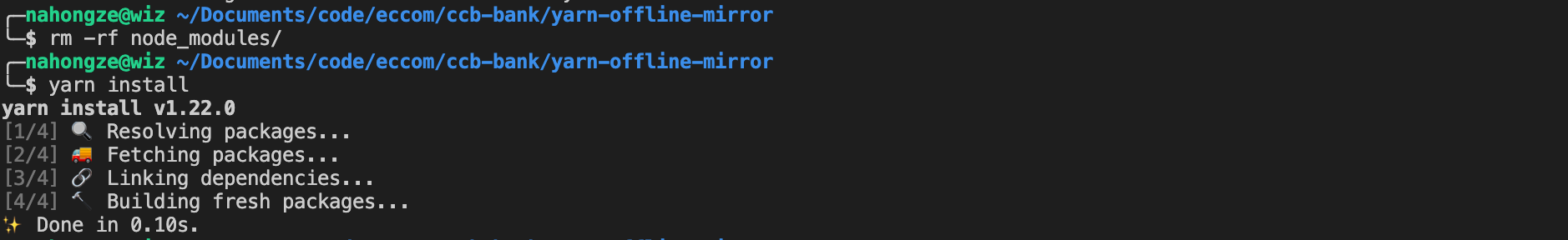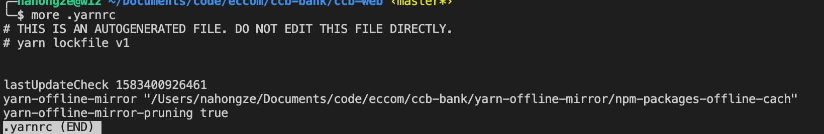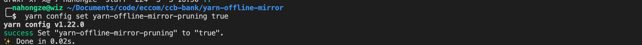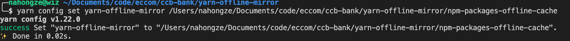 cd /Users/nahongze/Documents/code/eccom/ccb-bankmkdir yarn-offline-mirrorcd yarn-offline-mirror #离线包目录yarn config set yarn-offline-mirror /Users/nahongze/Documents/code/eccom/ccb-bank/yarn-offline-mirror/npm-packages-offline-cach