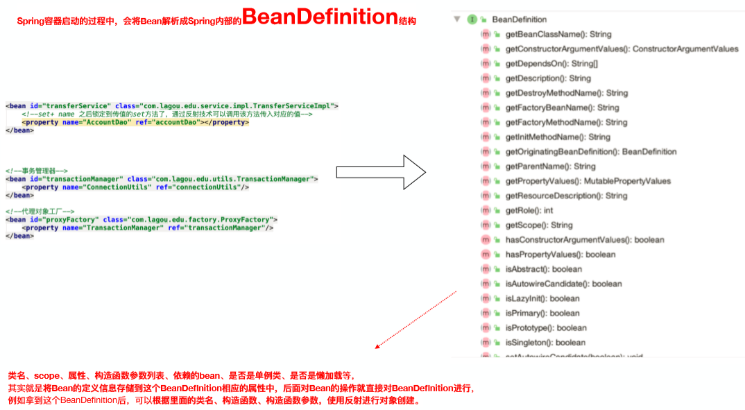 * spring启动时,spring读取加载xml配置文件中bean的信息,解析成一个一个BeanDefinition对象