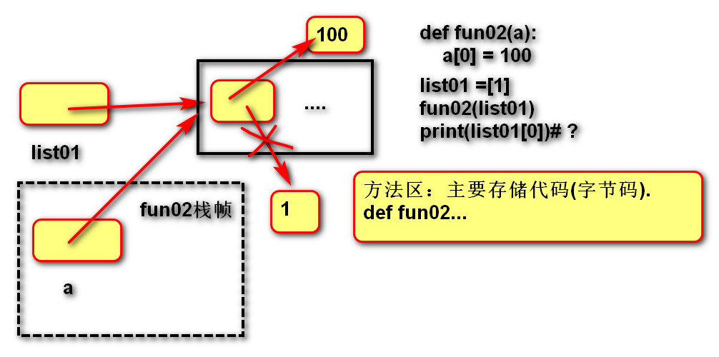 1 """ 2 函数内存图 3 练习:exercise06.py 4 练习:exercise07.py 5 15:40 6 """ 7 8 # 在方法区中存储函数代码,不执行函数体 9 def fun01(a): 10 a = 100 11 12 num01 = 1 13 # 因为调用函数,所以开辟一块内存空间,叫做栈帧 14 # 用于存储在函数内部定义的变量(包含参数). 15 fun01(num01) 16 # 函数执行完毕后,栈帧立即释放(其中定义的变量也会销毁). 17 print(num01)#1 18 19 def fun02(a): 20 # 改变的是传入的可变对象 21 a[0] = 100 22 23 list01 = [1] 24 fun02(list01) 25 print(list01[0])# 100 26 27 def fun03(a): 28 # 改变的是fun03栈帧中变量a的指向 29 a = 100 30 31 32 list01 = [1] 33 fun03(list01) 34 print(list01[0])# 1 35 36 37 def fun04(a): 38 a[1] = [200] 39 40 list01 = [1,[2,3]] 41 fun04(list01) 42 print(list01[1])# [200]
