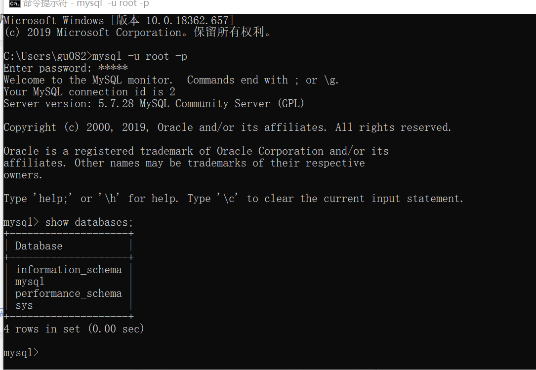 我输入后mysql -u root -p,在输入密码,显示是(28000)错误,密码正确(错误)! 首先修改my.ini文件,在[mysql]上面加上skip-grant-tables 关掉这个文件,在服务上重启MySQL服务,(里面有一个重启动) 再次执行mysql -u root -p 命令,不输入密码,直接Enter 然后进入到MySQL中:(忽略show databases;,这是后来打的)