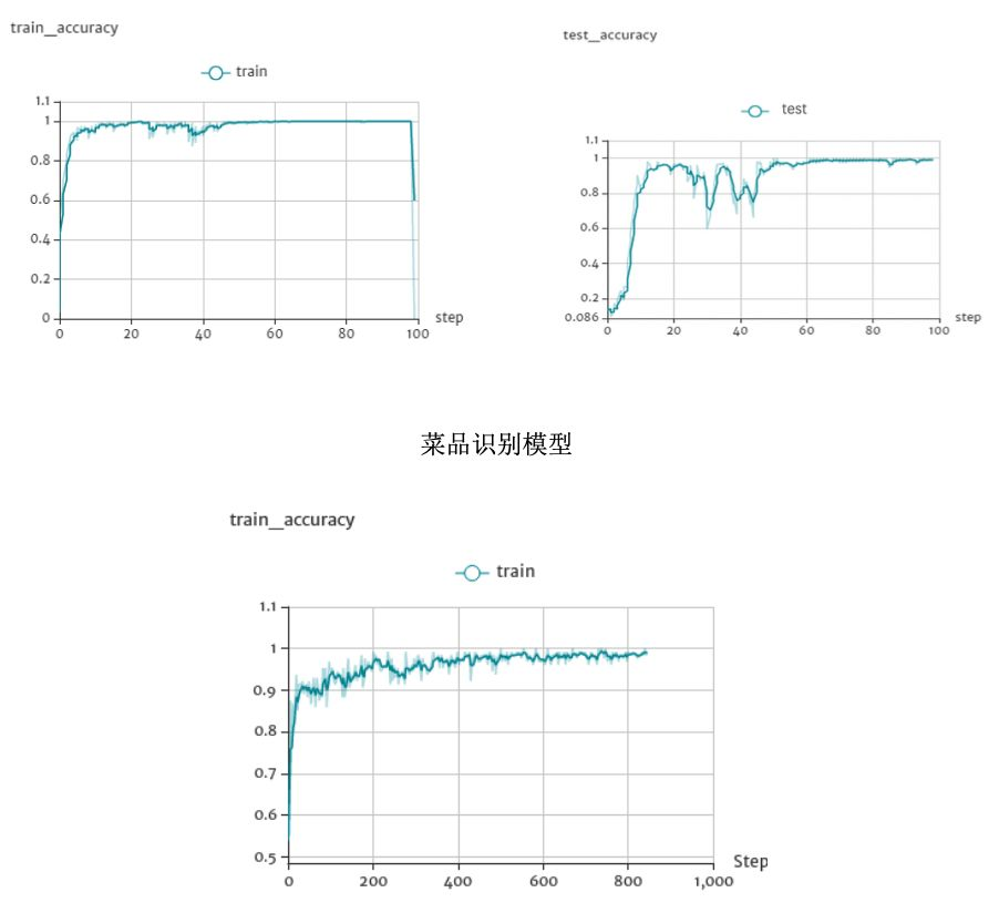 在上图中的左侧图片框中显示的是菜品摄像头实时拍摄的某帧画面,托盘中有芹菜炒肉、番茄炒蛋和米饭三样菜。在后端通过霍夫圆处理后并调用模型进行预测,最终将数据返回并在移动端显示,可以从上图中的右侧移动端截图中看到结果预测正确,该预测模型在35种菜品类别的数据集中能达到99%以上的准确度。