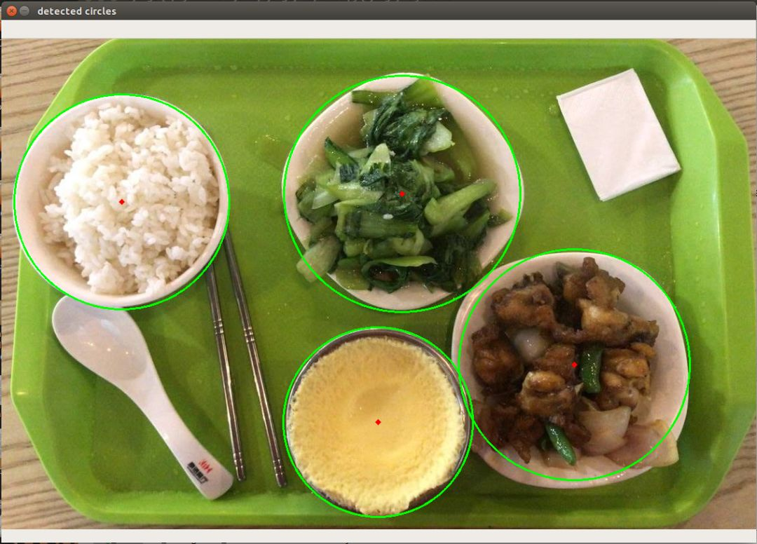 盛载菜品食物的碗盘器具基本是圆形的,因此对餐盘图像去噪后用霍夫圆变换实现对菜品碗盘位置的检测,实现碗盘分离。