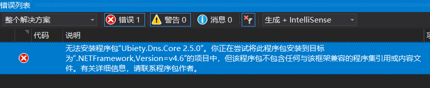 无法安装程序包“Ubiety.Dns.Core 2.5.0”。你正在尝试将此程序包安装到目标为“.NETFramework,Version=v4.6”的项目中,但该程序包不包含任何与该框架兼容的程序集引用或内容文件。有关详细信息,请联系程序包作者。