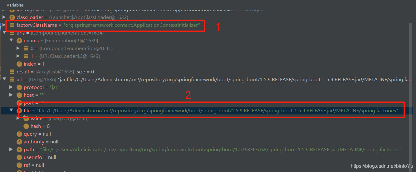 从下图可以看到,假设我们正在获取ApplicationContextInitializer的Initializer,那么此时factoryClassName为org.springframework.context.ApplicationContextInitializer。中可以看到,urls中的其中一个元素为绝对路径XXX/spring.factories。