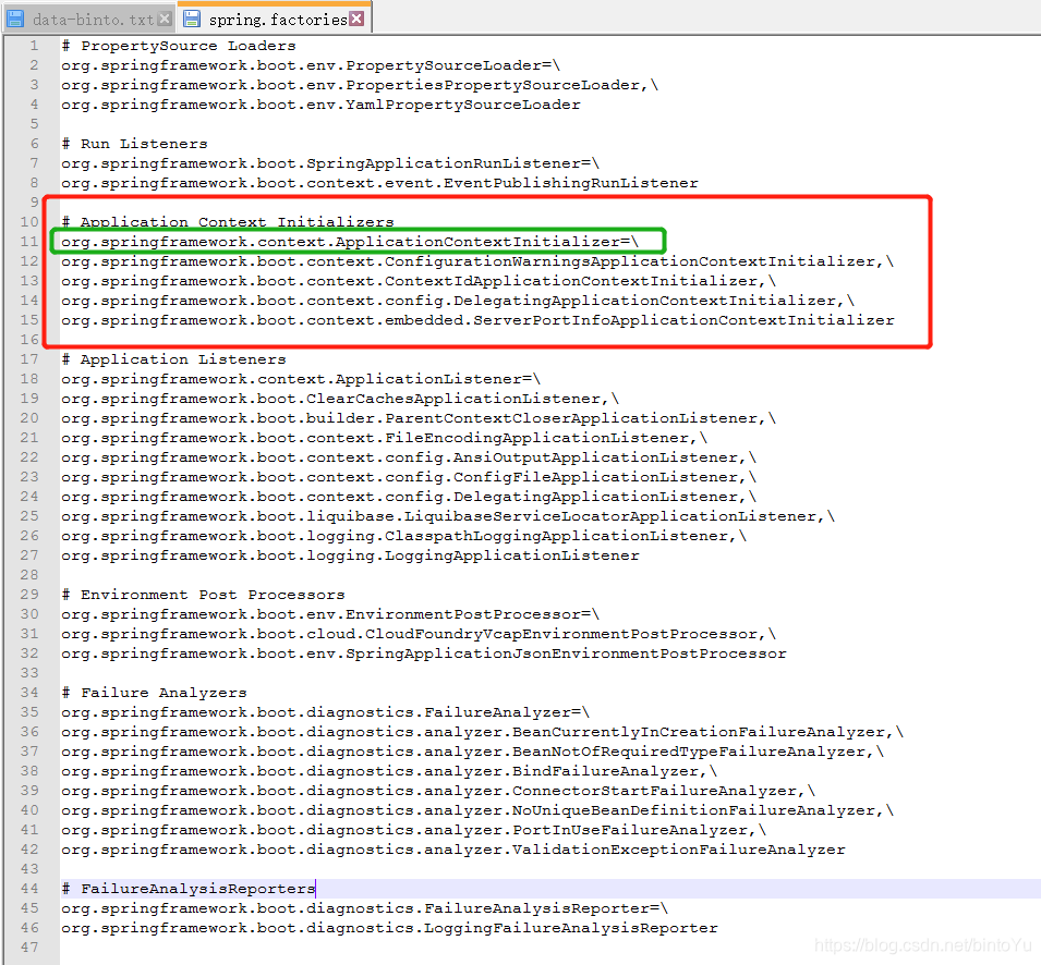 可以看到,spring.factories中一共含有七个大类,其中绿框就是我们本次要找的ApplicationContextInitializer,同时,从红框中可以看到,ApplicationContextInitializer由四个小类组成。记住七和四这两个数字。