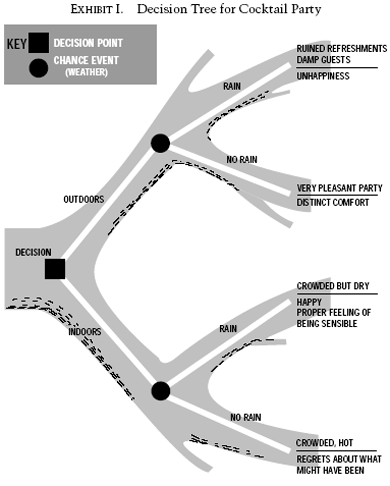 图表I说明了鸡尾酒会问题的决策树。此树是显示支付表中显示的相同信息的不同方式。然而,正如后面的例子所示,在复杂的决策中,决策树通常是比付款表更清晰地呈现相关信息的方式。