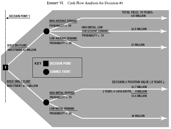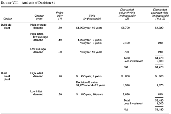 现在转到图表VI。在上半部分的分支右侧,如果建造了一个大型工厂,我们会看到各种事件的收益率(这些仅仅是图表IV中的数字乘以)。在下半部分,我们看到小型工厂数据,包括决策#2位置值加上决策#2之前两年的收益率。如果我们通过概率减少所有这些产量,我们得到以下比较: