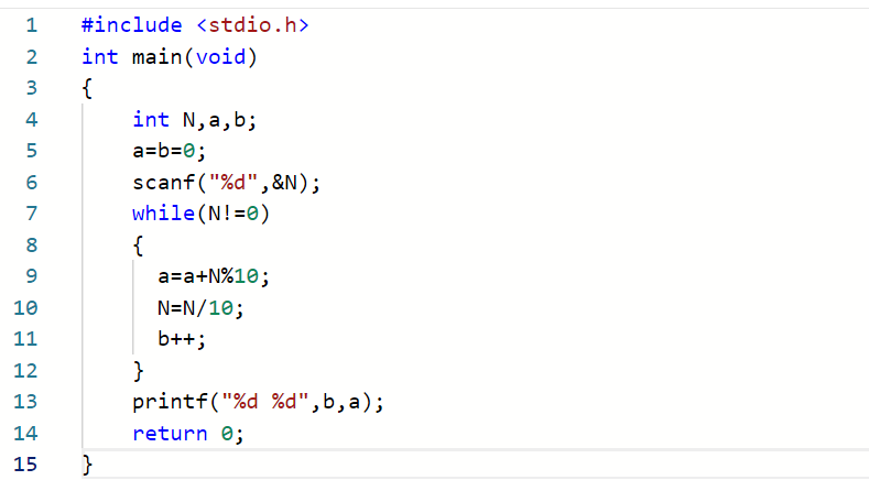 对于给定的正整数N,求它的位数及其各位数字之和。