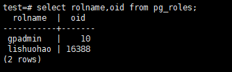 通过pg_roles字典查看数据库的用户信息:select rolname,oid from pg_roles;