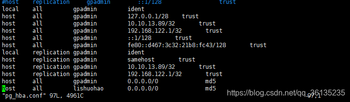 3.创建完用户后,还需要修改pg_hba.conf文件,来赋予用户的远程登录权限,通过gpstop –u命令重新加载配置文件,使之生效。
