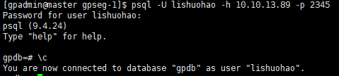4.键入psql -U lishuohao -h 10.10.13.89 -p 2345及密码,即可连入数据库,\c查看当前连入数据库的用户