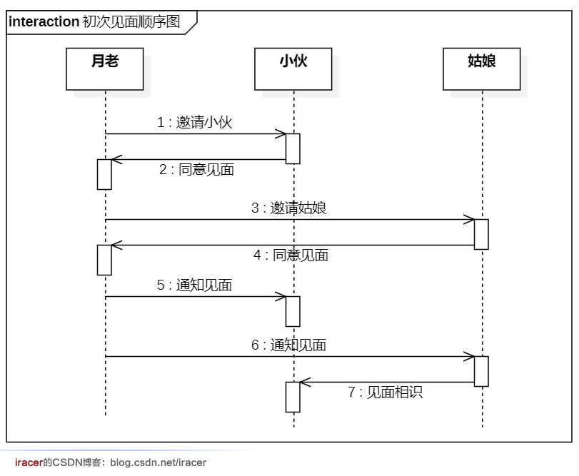 - Sequence diagram:顺序图,对象之间的消息交互,强调消息执行的顺序的交互图