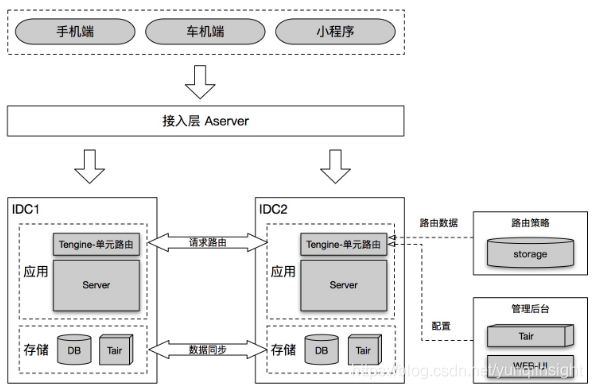 账号系统服务是三地四机房部署,数据分别存储在tair为代表的缓存和XDB里,数据存储三地集群部署、全量同步。账号系统服务器的Tengine上安装UntiRouter,它请求的负责单元识别和路由,用户单元划分是通过记录用户与单元关系的路由表来控制。