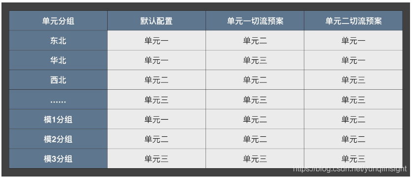 分组与单元的映射有一个默认关系,这是按地理就近来配置的,比如华南对应深圳。除了默认的映射关系,还有几个用于切流预案的关系映射。