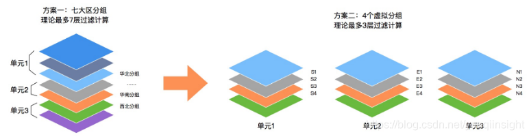 通过日志分析出用户所属大区后,我们将不同分组做成多个布隆过滤器,计算时逐层过滤。这个计算有两种特殊情况: