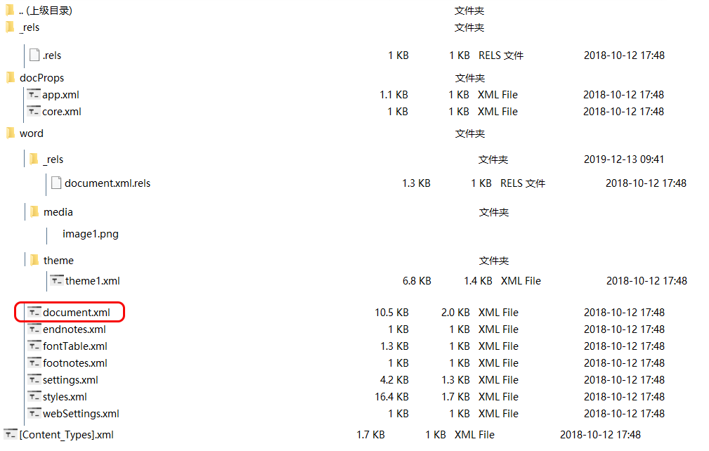我们主要看document.xml文件,这个文件是整个docx的骨架,类似于前端页面的html文件,是最基础、也是最重要的文件。
