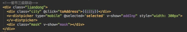 <!--省市三级联动--><div class="liandong"> <div class="city" @click="toAddress">{{city}}</div> <v-distpicker type="mobile" @selected='selected' v-show="addInp" style="width: 300px"> </v-distpicker> <div class="mask" v-show="mask"></div></div>