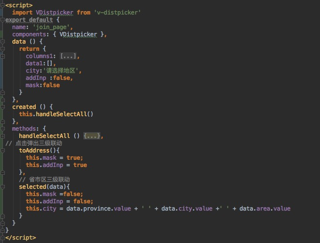 <script> import VDistpicker from 'v-distpicker'export default { name: 'join_page', components: { VDistpicker }, data () { return { city:'请选择地区', addInp :false, mask:false } }, methods: {// 点击弹出三级联动 toAddress(){ this.mask = true; this.addInp = true }, // 省市区三级联动 selected(data){ this.mask =false; this.addInp = false; this.city = data.province.value + ' ' + data.city.value +' ' + data.area.value } }}</script>