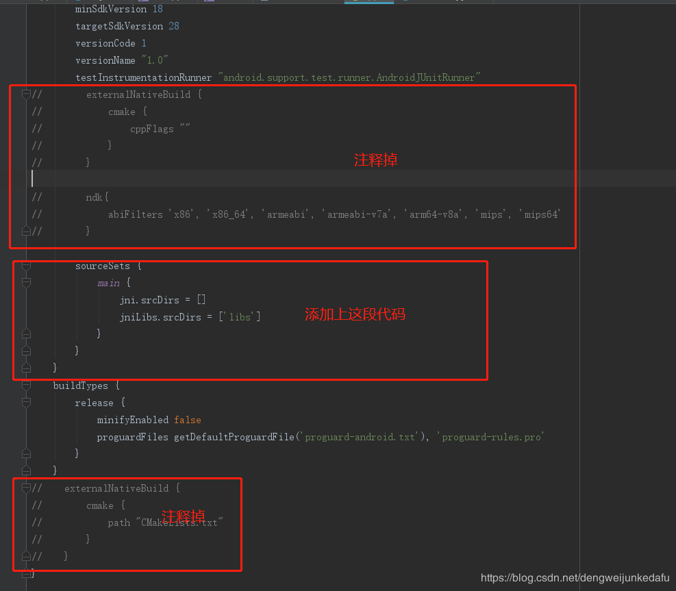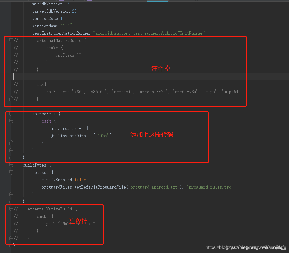 最后运行的时候,记得把build.gradle文件中的生成cmake相关的代码注释掉,同时需要添加一段代码,否则会报错:couldn't found "libtest-lib.so"。如下图所示: