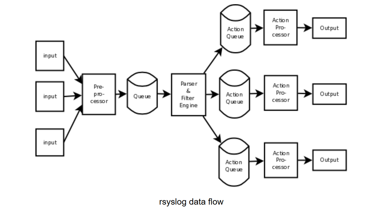 核心是rsyslog守护进程,该服务负责监听Linux下的日志信息,并把日志信息追加到对应的日志文件中,一般在/var/log目录下。 它还可以把日志信息通过网络协议((支持input有:RFC 3195,file,zmq3,klog等;))发送到另一台Linux服务器上,或者将日志存储在MySQL或Oracle等数据库中(支持的output有ES,mongo,mysql),当然还有一堆features,比如邮件发送啊,压缩啊等等,。 目前rsyslog的大版本为v8, 为电脑默认安装的是v7。 主要处理过程与其他日志处理方案一样,input->modify->output,每个环节都有若干插件可以使用。