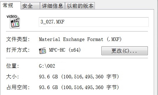 有这样一个MXF格式的视频,是由索尼SONY PXW-X280摄像机拍摄的,拍摄过程中由于电池耗尽,造成最后一个MXF视频文件没有封装完成,在卡里显示视频大小为93G,但是文件后缀是RSV,却不是MXF,如下图。