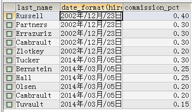 SELECT last_name,DATE_FORMAT(hiredate,'%Y年/%m月/%d日'),commission_pct
