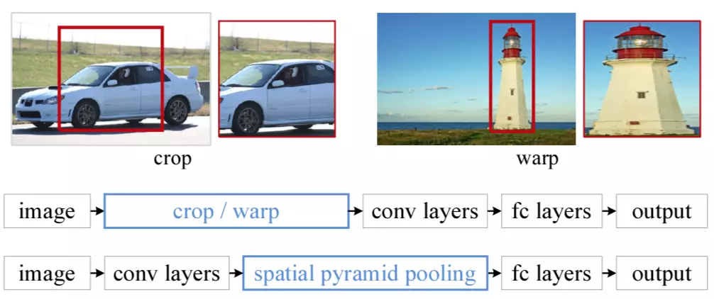 SPP-net的处理方式:不固定图像的大小,直接输入给卷积层处理,卷积出来的特征并不是直接输入给全连接层,而是在spatial pyramid pooling layer提取各个region proposal的特征(具体过程见下段),然后得到一个固定长度的输出传给全连接层,最后输出结果。 理论上说,SPP-net支持直接以多尺度的原始图片作为输入后直接BP训练即可。