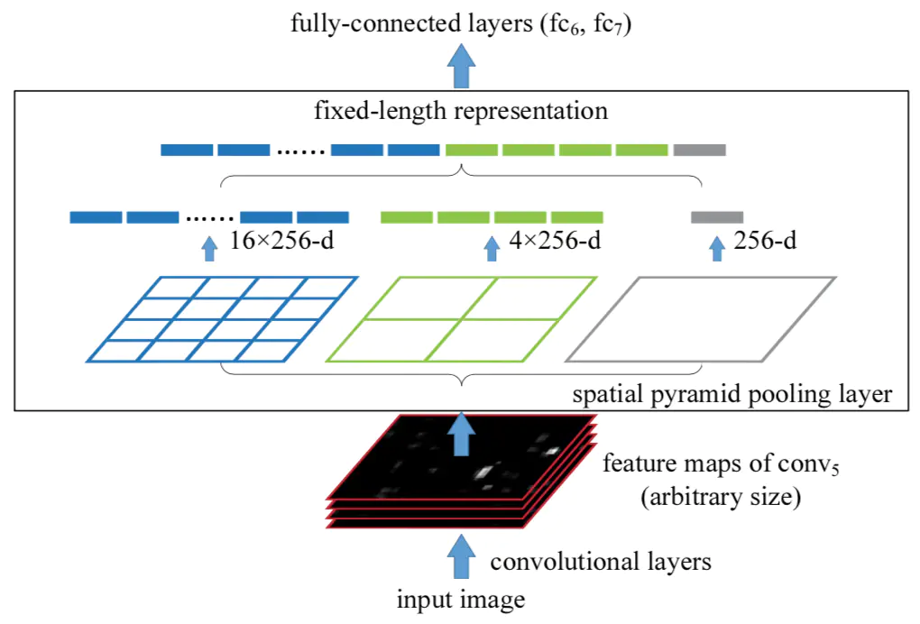SPP层如上图,位于最后一个卷积层(conv5)与全连接层之间。黑色图片代表卷积之后的256个特征图,256-d代表卷积层conv5的层数,接着我们以不同大小的块来提取特征,分别是4*4,2*2,1*1,将这三张网格放到下面这张特征图上,就可以得到16+4+1=21种不同的块(Spatial bins)。