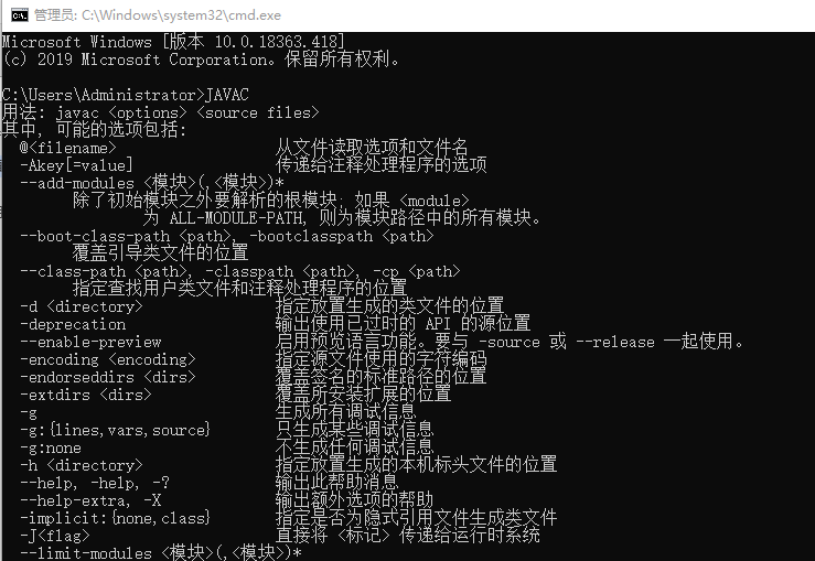 测试JDK环境变量的配置成功与否。在DOS命令行窗口输入“JAVAC”,输出帮助信息即为配置正确