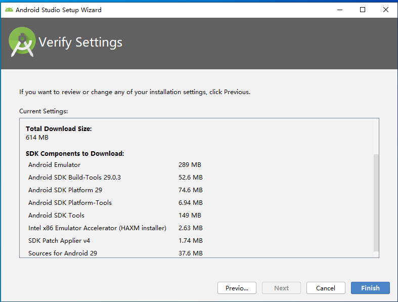 当进入到Verify Settings界面时,直接点击finish按钮,进行SDK的安装
