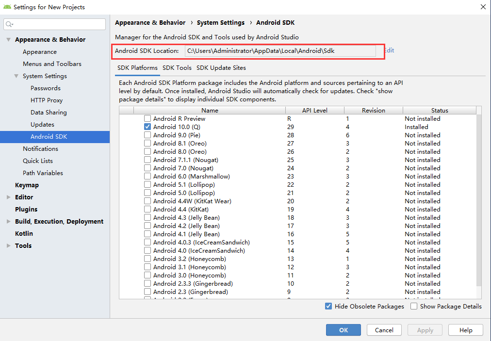 b.系统变量——新建 变量名ANDROID_HOME,变量值为SDK的安装目录 C:\Users\Administrator\AppData\Local\Android\Sdk